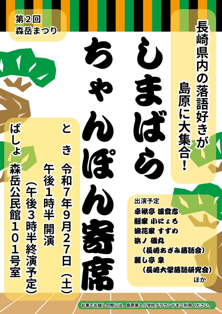 とき:2025年9月27日(土) 13:30開演ところ:森岳公民館演目・演者「山号寺号」波登志「寿限無」泉「さがや」磯丸「親の顔」凡五「つる」小にょろ「兵庫船」すずめ 第2回森岳まつりにて、長崎あざみ落語会から浜ノ磯丸、長楽亭凡五が出演させていただきました。また長崎大学落語研究会の麗し亭泉さんもご一緒しました。地元島原で活躍中の鰻家小にょろさん、浪花家すずめさんと初の共演でとても刺激を受けました。ご来場ありがとうございました。